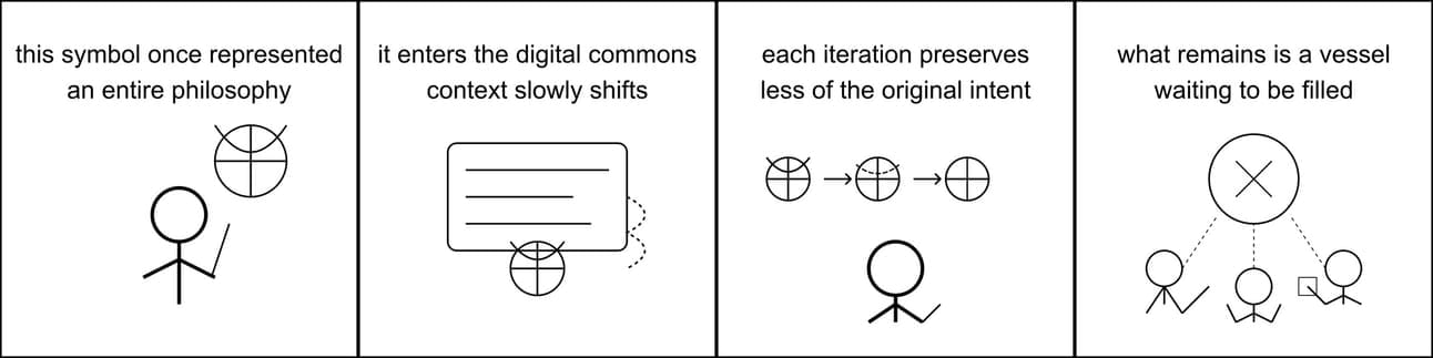 Once something enters the memetic slipstream, it obeys different laws. It can be stripped of all meaning and re-skinned infinitely. See: Pepe the Frog. The original purpose ceases to matter. All that remains is recognizability. This is how protest signs become punchlines, how profound ideas are strip-mined into Wojak panels, how symbols lose their referents.